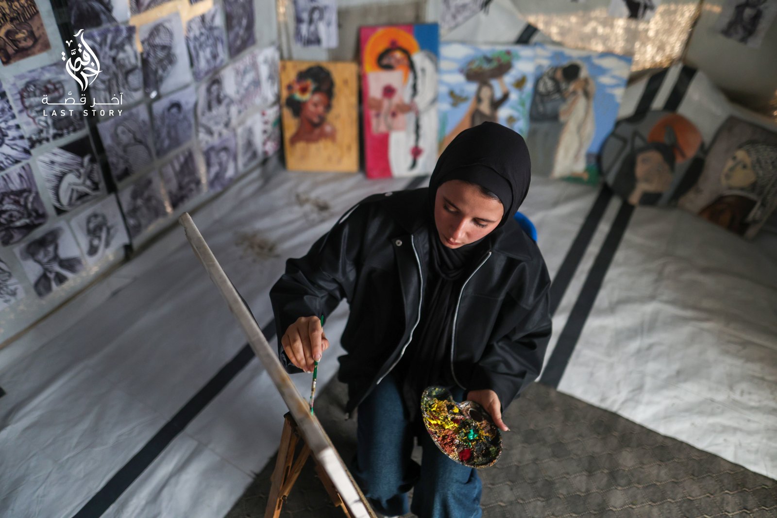 في خيمة صغيرة، جدرانها الرقيقة مثقلة برسومات كانت نتاج عامين من الحرب، تتأمل مرح الزعانين (18 عامًا) اللوحات المعلقة واحدة تلو الأخرى. أعمال رسمتها بشق الأنفس تحت وقع الغارات؛ فحين يغمر الليل خيمتهم ويغفو أفراد العائلة، تبدأ مرح بمنح الورقة التي بين يديها خطوطًا من قلم الحبر الأسود، لتولد رسمة جديدة تحمل قصة وعنوانًا.