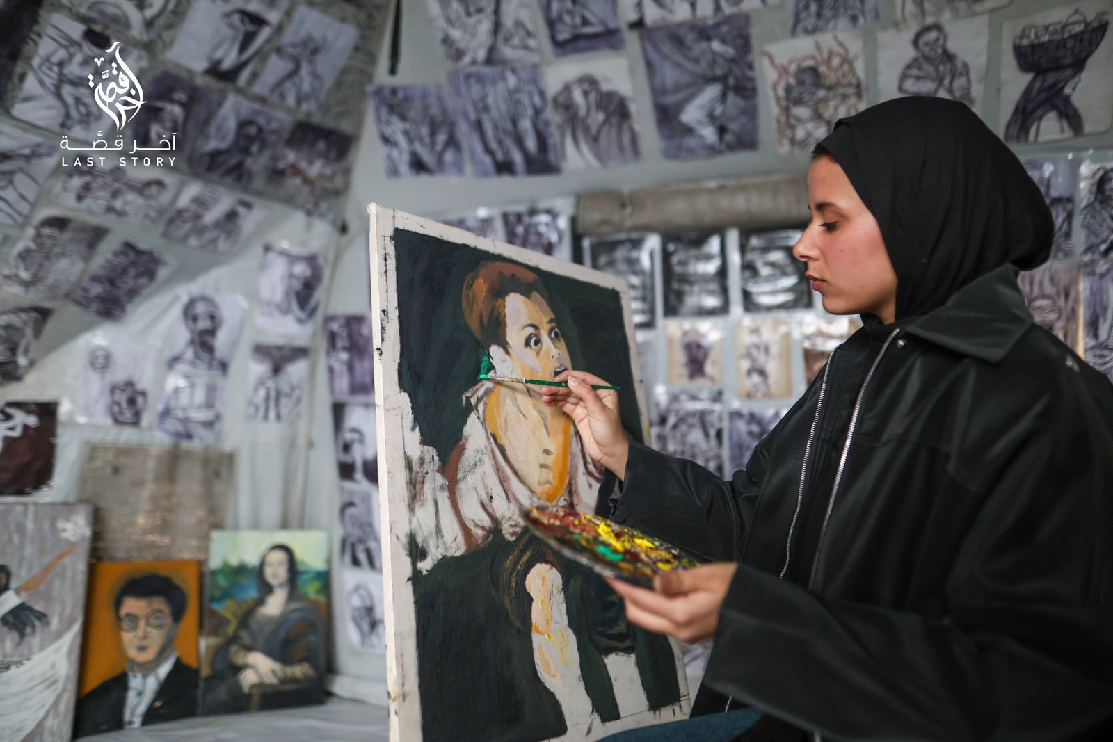 ومع تصاعد الحرب، تطورت علاقتها بالرسم ليصبح وسيلتها للتفريغ النفسي؛ تصمت حين يرهقها التفكير وتفزعها الانفجارات، فيما يبقى الورق ملاذها لتهدئة عقلها وقلبها الخائف. ورغم أنها لم تتلقَّ تعليمًا فنيًا رسميًا بعد، بعد إنهائها الثانوية العامة مؤخرًا، فإنها لم تلتحق بالجامعة لعدم تفضيلها الدراسة عن بُعد التي فُرضت على طلبة قطاع غزة جرّاء النزاع وتدمير معظم المراكز التعليمية.