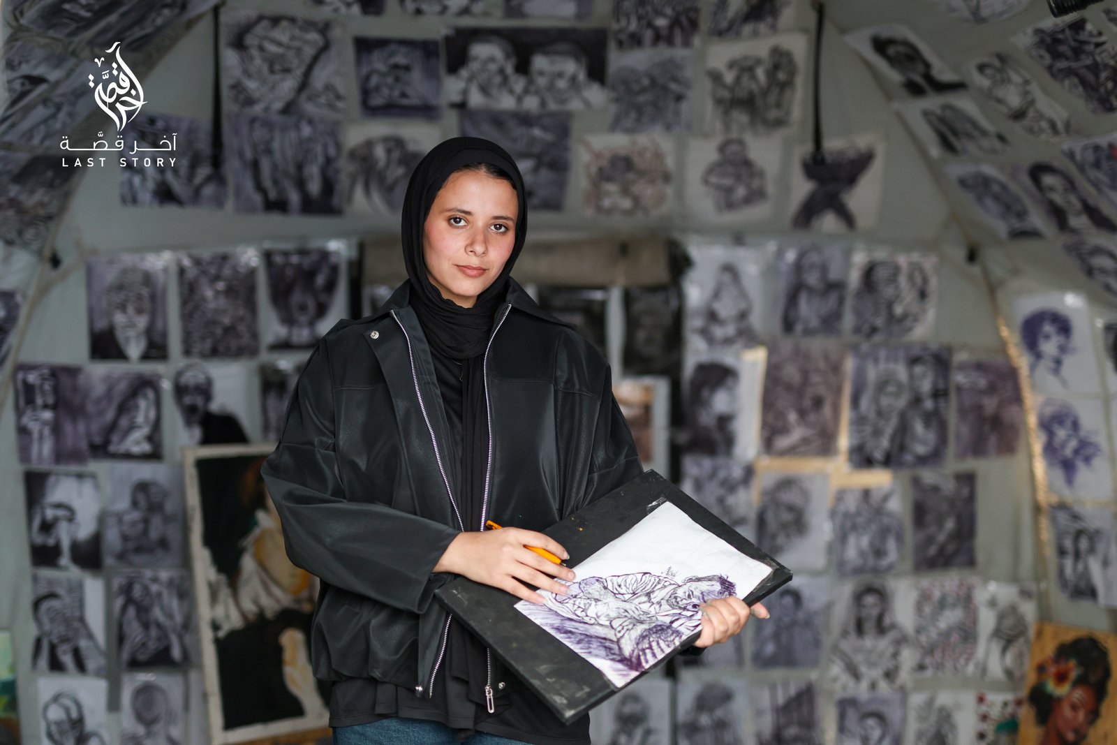 في خيمة صغيرة، جدرانها الرقيقة مثقلة برسومات كانت نتاج عامين من الحرب، تتأمل مرح الزعانين (18 عامًا) اللوحات المعلقة واحدة تلو الأخرى. أعمال رسمتها بشق الأنفس تحت وقع الغارات؛ فحين يغمر الليل خيمتهم ويغفو أفراد العائلة، تبدأ مرح بمنح الورقة التي بين يديها خطوطًا من قلم الحبر الأسود، لتولد رسمة جديدة تحمل قصة وعنوانًا.
