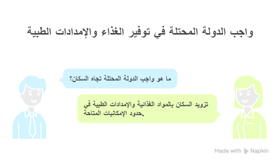 وتنص المادة 55 من اتفاقية جنيف الرابعة صراحة على أن "للدولة المحتلة، في حدود الإمكانيات المتاحة لها، واجب ضمان تزويد السكان بالمواد الغذائية والإمدادات الطبية" .