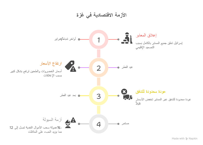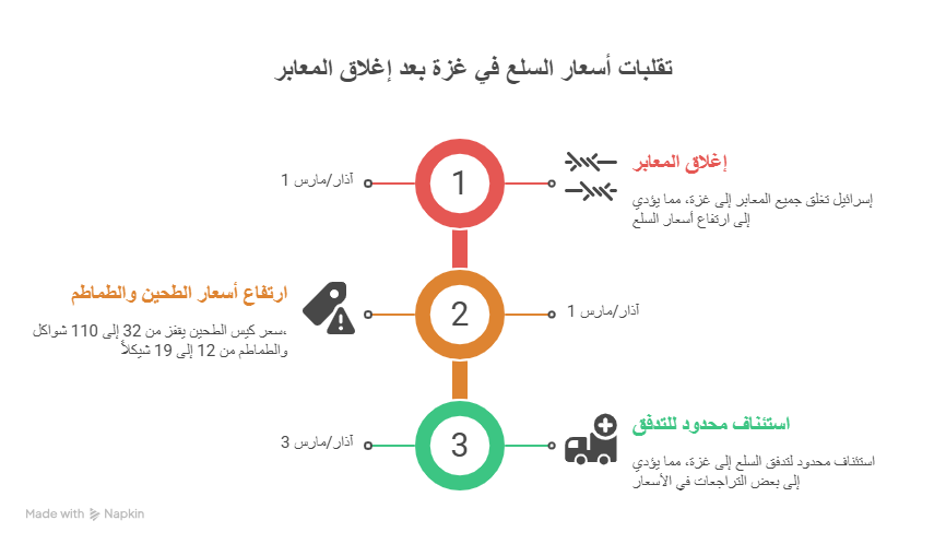 ففي الأول من آذار/مارس، وهو اليوم التالي للإغلاق، قفز سعر كيس الطحين من 32 إلى 110 شواكل، والطماطم من 12 إلى 19 شيكلاً. ومع استئناف محدود للتدفق في الثالث من آذار/مارس، بدأت بعض الأسعار تتراجع، لكن أخرى واصلت الصعود، ما كشف عن هشاشة استثنائية في السلسلة التموينية.