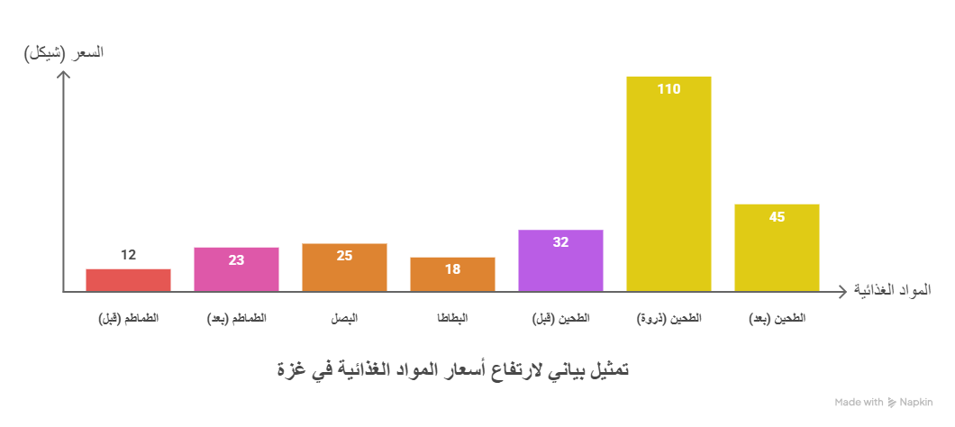 قبل أسابيع قليلة، كان سعر الكيلو الواحد من الطماطم لا يتجاوز 12 شيكلاً. اليوم، وبعد سلسلة من الإغلاقات المفاجئة للمعابر تزامنا مع عيد الفطر، قفز السعر إلى 23 شيكلاً، بينما بلغ سعر كيلو البصل 25 شيكلاً، والبطاطا 18 شيكلاً. أما كيس الطحين (25 كغم)، فبعد أن كان متاحاً بـ32 شيكلاً، ارتفع إلى 110 شواكل في ذروة الأزمة، قبل أن يستقر عند 45 شيكلاً بعد عودة محدودة للتدفق.